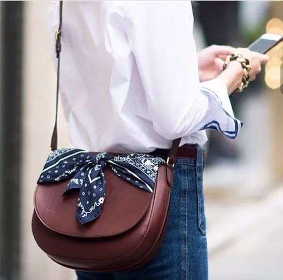 大家应该对丝巾缠在包包上这个用法不陌生,之前丝巾缠在包带上就非常流行,但是下面2张图提供了别的思路,我觉得看起来更轻松一点,没那么一本正经。