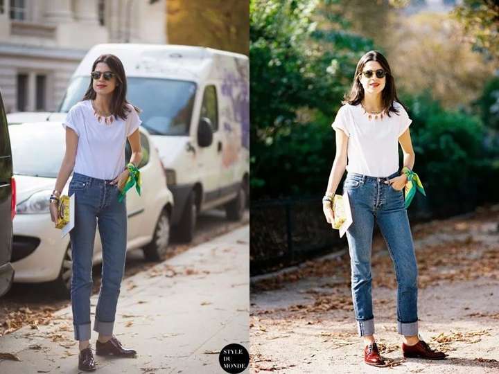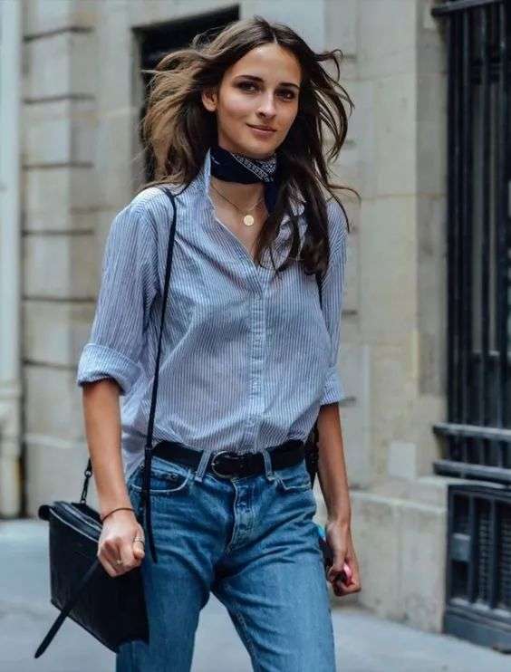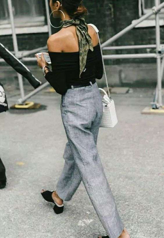 ➤丝巾和下装颜色相呼应:选择下装同色系的丝巾,整体穿搭是不是更统一,更好看呢。