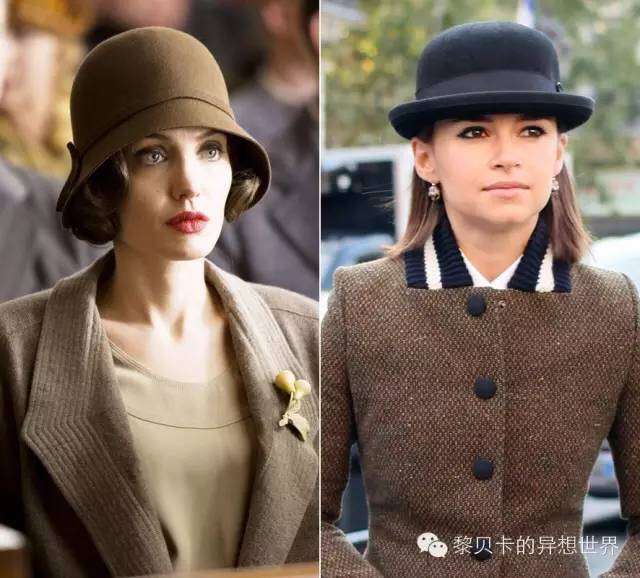 很圆的钟形帽和小圆顶礼帽很适合方脸星人。不过最好选择帽檐朝下(左)而非帽檐上翘(右),戴的时候发型也有讲究,像左边安吉丽娜朱莉这样把头发放在耳朵前会比夹到耳后效果好很多。