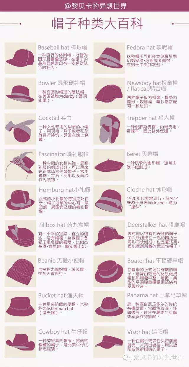 适合:鸭舌帽、贝雷帽、渔夫帽、宽檐帽