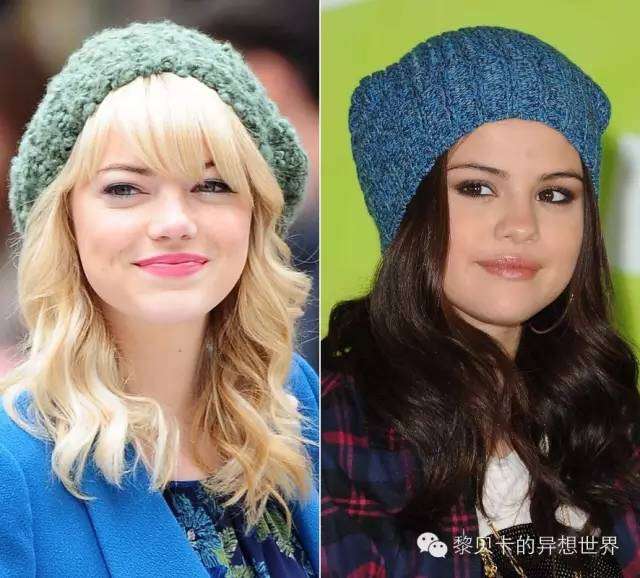 圆脸们也可以戴没有帽檐的针织便帽,但戴它时要搭配斜分刘海或者中分发型才能更好地修饰脸型。尽量把帽子往额头后方戴。对比一下。左边艾玛石就显得脸部线条更修长了,右边Selina Gomez就显得更加圆鼓鼓的。