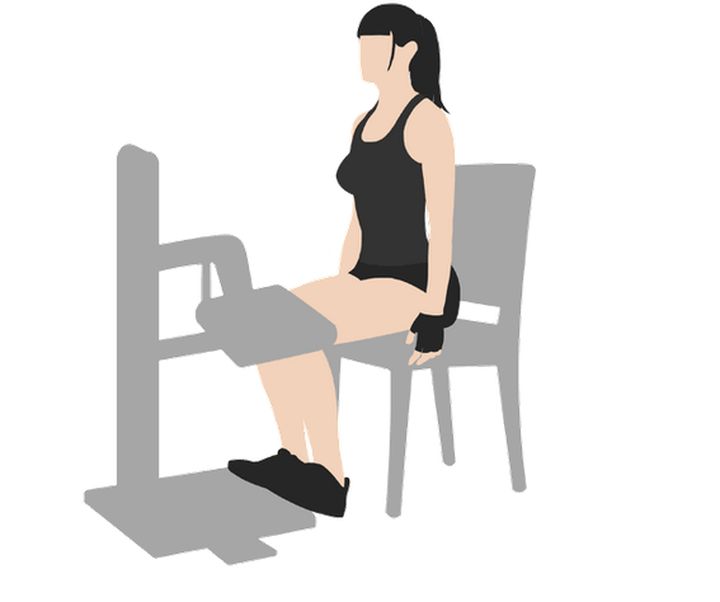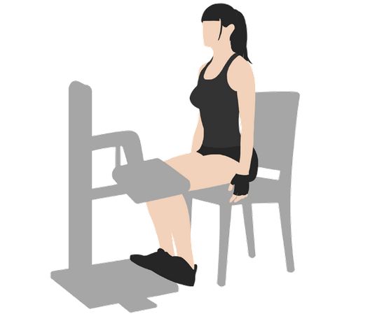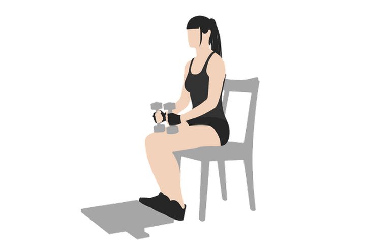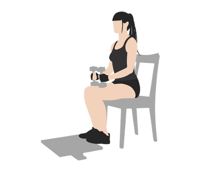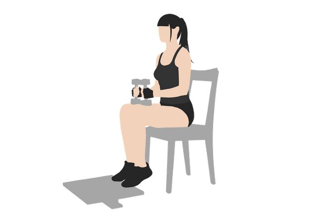 1 坐在平凳或其他稳定的物体上,前脚掌至于垫片上,大腿平行于地面,小腿垂直于大腿,双手持哑铃置于膝盖上;