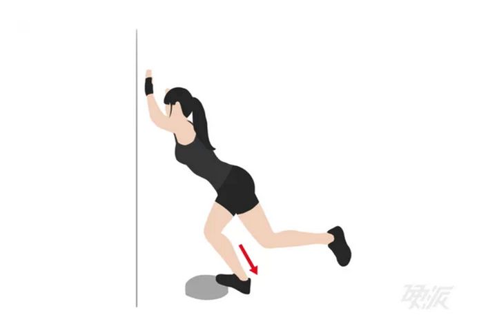 1 选择铃片或有高度的重物做辅助。单脚站立,拉伸腿的前脚掌落在铃片上,后半部分保持悬空,两手扶墙保持平衡;