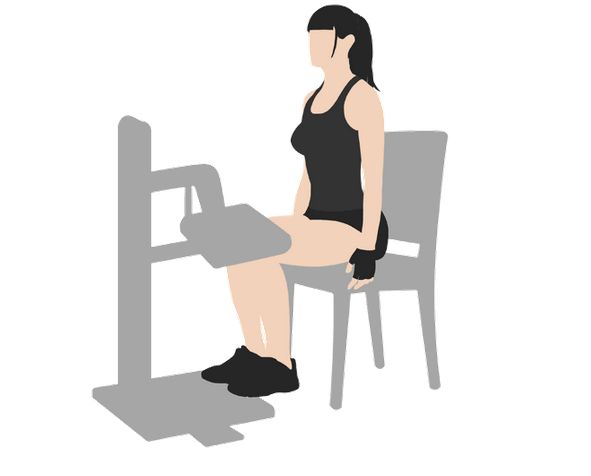 1 坐在器械上,调整合适重量的负重,大腿紧贴训练垫,双脚前掌放在踏板上;