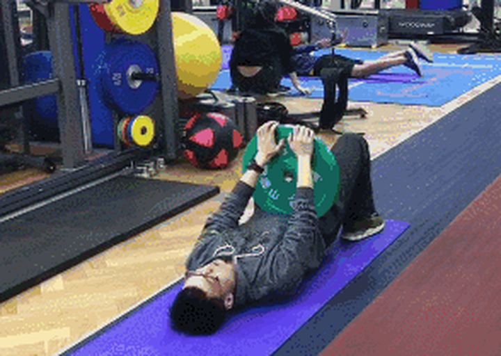 动作要点:双腿与肩同宽仰卧于瑜伽垫上,靠臀肌的力量将杠铃片向上伸展推起,过程当中“快起慢落”。