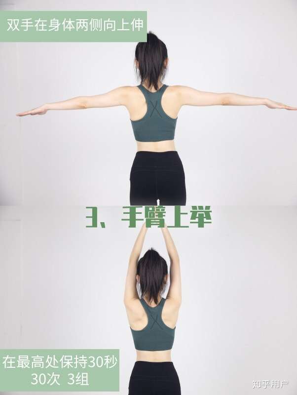 双手在身体两侧伸直后在缓慢往上伸,在高处保持30秒,注意不要耸肩哈。