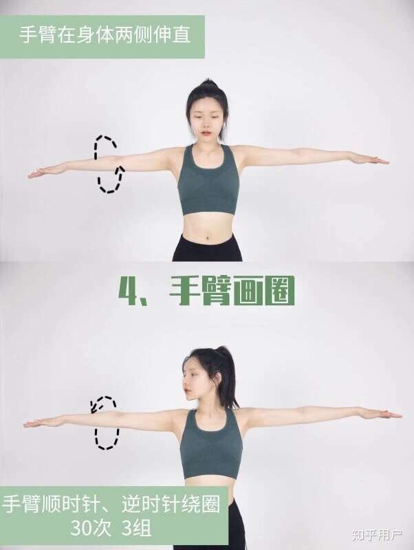 双手在身体两侧平举,手臂顺时针、逆时针分别绕圈,记住绕圈时手臂不要放松