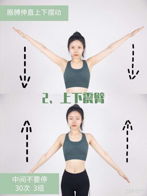 胳膊伸直,与身体保持垂直,注意收紧腹部,上下摆动手臂,记住中间不要休息,胳膊越酸,效果就越好