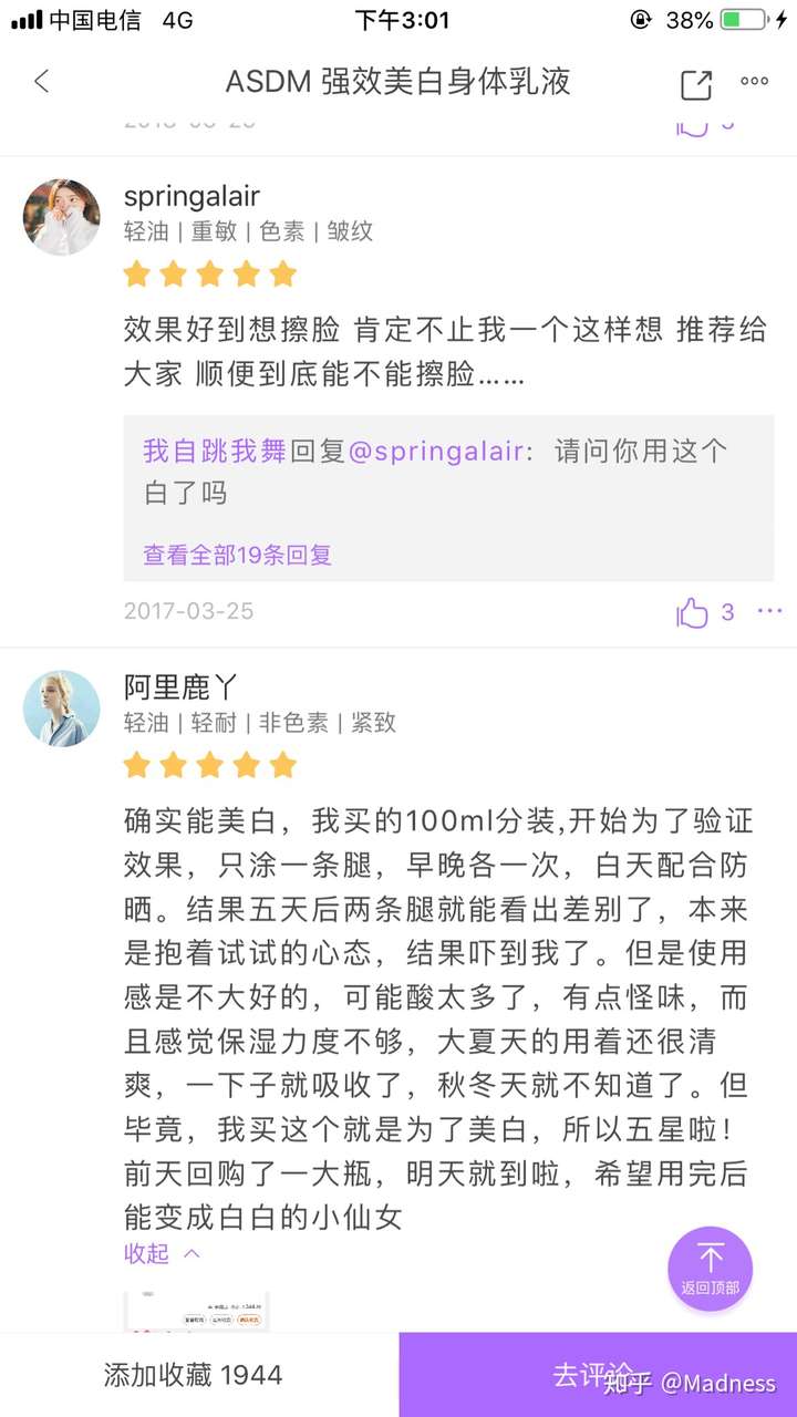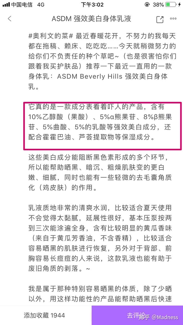 如果不想太猛这里有一个10%果酸的推荐,ASDM强效美白身体乳,这瓶我三月份用了一段时间,2月份在家腿上起包留下的色素沉淀真的有淡化!粗糙一些的妹子用这个肯定可以变嫩变白,相当于一瓶顶两瓶,所以美白嫩肤是离不开果酸的