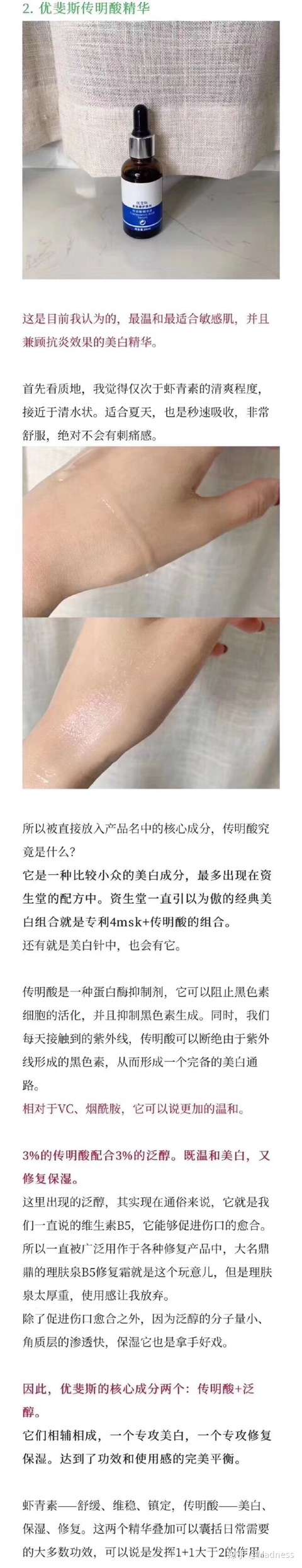 先说面部的,我非常非常推荐传明酸,真的真的一定要用传明酸精华。被称为最温和的美白精华!美白针的主要成分!作为敏感肌的我吹爆!!自己多去做做功课吧。传明酸是我现在唯一在用的美白精华。唯一缺点,涂多了会黏,所以每次两滴就杠杠好使。而且优斐斯传明酸保湿效果巨好,去年冬天在家空气干燥➕轻微过敏,每天什么都不涂我只涂虾青素传明酸,恢复的非常快