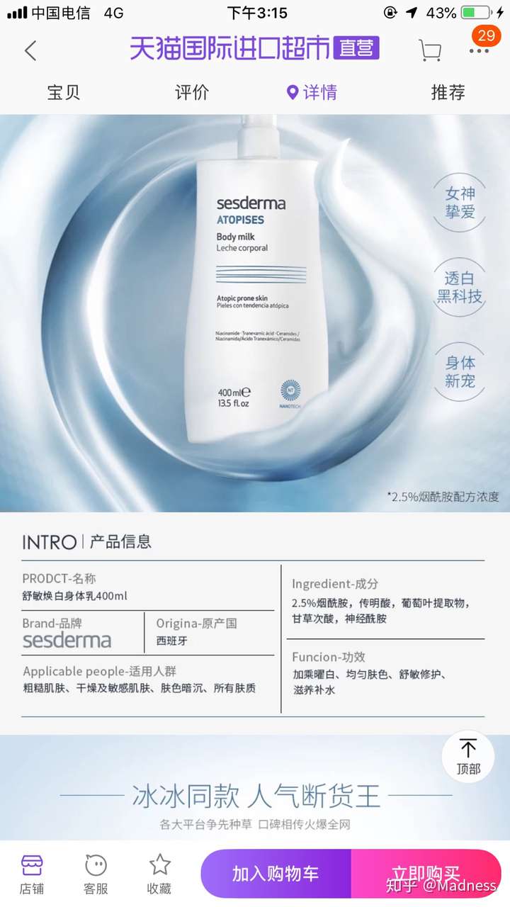 我比较推荐 sesderma身体乳【其实也很多人安利了用不着我推荐了8哈哈哈哈哈】,他家的焕白身体乳,这个是真的好用!!听我的准没错!!而且便宜!400ml特价的时候138就可以拿下!sesderma家的果酸身体乳也值得买!真的很温和!