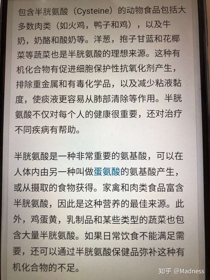 至于半胱氨酸,可以从食物中获取【包括大多数肉类以及牛奶】,一般正常吃饭的人应该都没有很缺乏半胱氨酸吧?人体内的其他氨基酸也可以合成半胱氨酸,没记错的话,维生素b族也可以防止类半胱氨酸氧化【记不清了如果有错误请大家指出。我是觉得不要随便乱补充这些东西。我看吃美白丸的姐妹们很多月经推迟的。