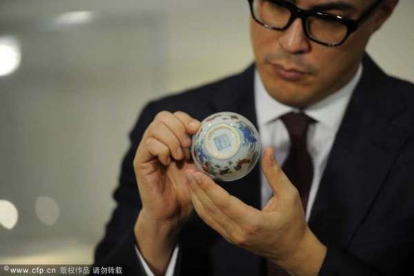 然后再釉上彩,这彩还不是一次上完,这鸡不是有黄色有红色嘛,先画黄的,再画红的……最后出来这么个小杯。