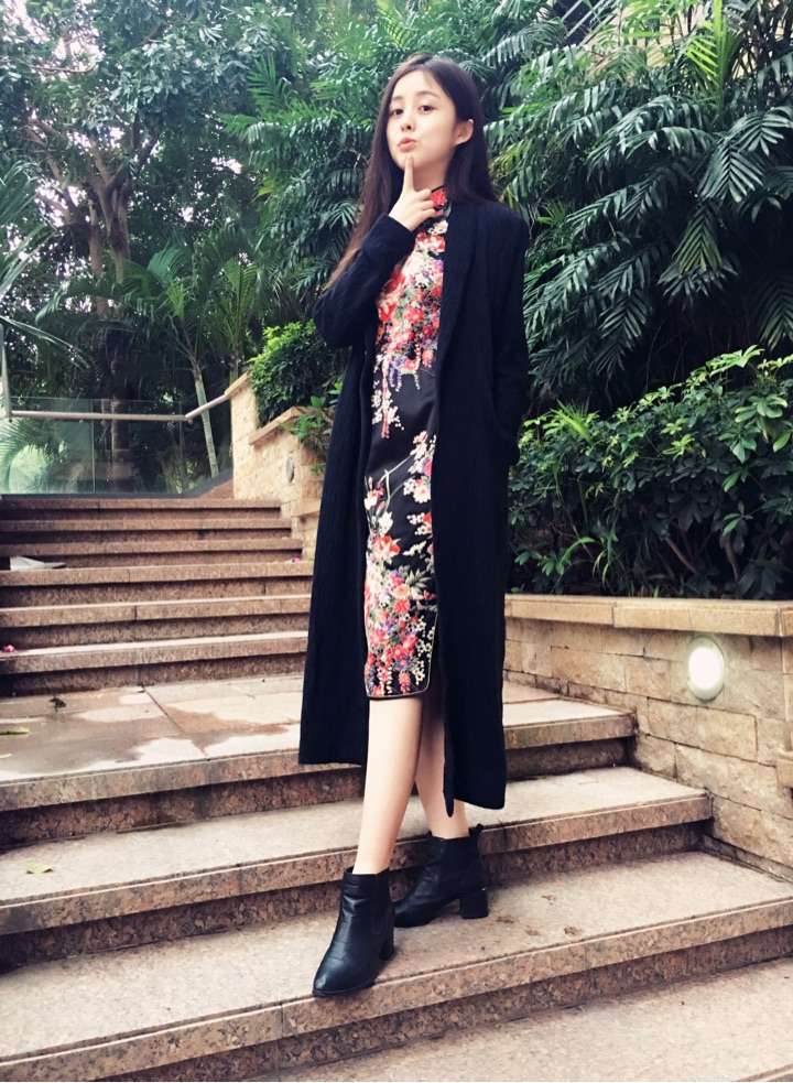 偷穿妈妈的花旗袍的时候,因为尺码不合适,还是罩个长外套吧:)
