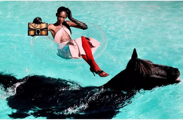 在GUCCI的2020春夏系列广告大片中,一双红色的长袜就显得格外瞩目。⬇