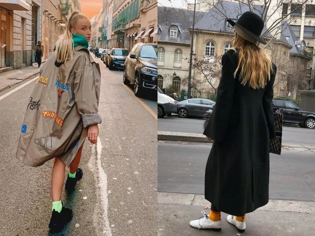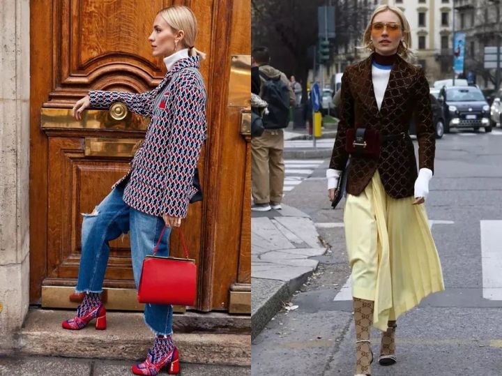 如果脚上选择了较为繁复的提花袜的话,建议身上的元素能减则减,尤其是复杂的印花单品,坚决不要再选择了。