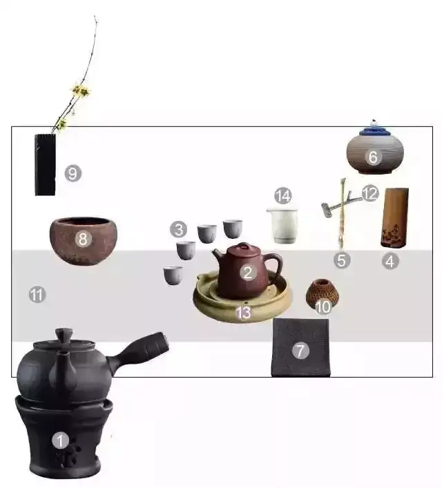 基本茶席的元素构成,主要包括:煮水器、泡茶器、匀杯、茶杯、茶仓、滓方、茶荷、茶则、壶承、茶托、洁方、席布、插花器等器皿。