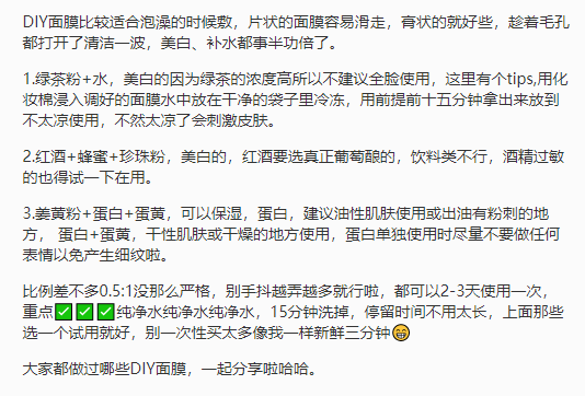 百变天后涵涵子也是喜欢DIY面膜的大户,看看这配方,再加点面粉感觉都能直接烤出蛋糕了,真的不会越做越饿吗?