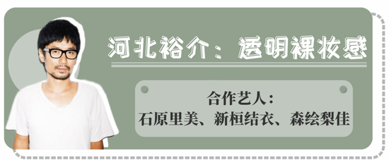 河北裕介老师的妆容更多在于一些面容的调整,但却能够突出人本身的特色,透明的裸妆感在他的妆容中也是非常重要的一点,营造出一种天生丽质的感觉!