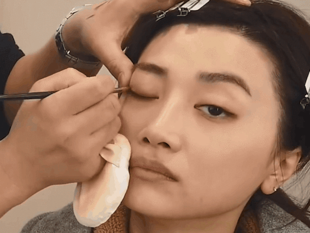和河北裕介老师不同的是,徐玉老师粉底用量不仅不多,而且更擅长用刷子打造底妆,从脸中慢慢向外延伸开,动作也是很温柔,这样的底妆可以做到非常轻薄!再叠加层也不会很厚重,天生好肌肤的感觉~