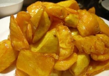 ④把刚刚炸好的红薯放入有焦糖的锅中拌匀即可食用(食用时可先浸一下冷水,焦糖会变脆)。