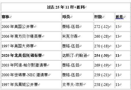 达斯汀-约翰逊取得11杆胜利,为2006年以来巡回赛最大胜差。过去25年,总共只有7场胜利,胜差为11杆及更多。4场属于泰格-伍兹。达斯汀-约翰逊、菲尔-米克尔森和史蒂夫-琼斯(Steve Jones)各拥有1场。