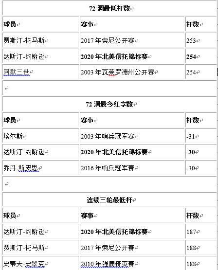 达斯汀-约翰逊追平或者创造了各种杆数纪录。他是美巡赛历史上第一个在卡帕鲁瓦之外打到低于标准杆30杆的球员。他的72洞杆数254杆为美巡赛历史上第二低杆数。以下让我们来看一下他在记录簿中的排名。