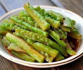 原料:柿子椒150克,苦瓜250克,盐、味精各1克,酱油、料酒、白糖各3克、葱花、姜末各5克,植物油20克。