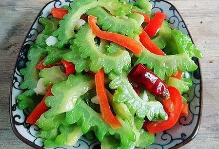 新鲜苦瓜250克,麻油、蒜蓉、香菜末、番茄酱、醋皆适量。把苦瓜洗净,去掉瓜瓤,用外边一层,拿刀削成透明薄片,放在碗里,添加麻油、番茄酱、醋、蒜蓉拌匀,撒上香菜末即可。开胃消食、清暑美容,对慢性胃炎、吸收不良综合征、中暑、单纯性消瘦均有疗效。