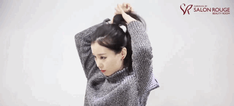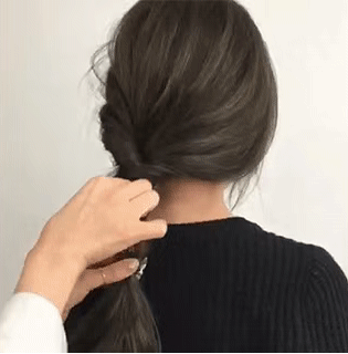 STEP 1:首先扎一个低马尾,从中间掏出一个洞,将扎好的马尾从下往上塞进去,扯出慵懒感;
