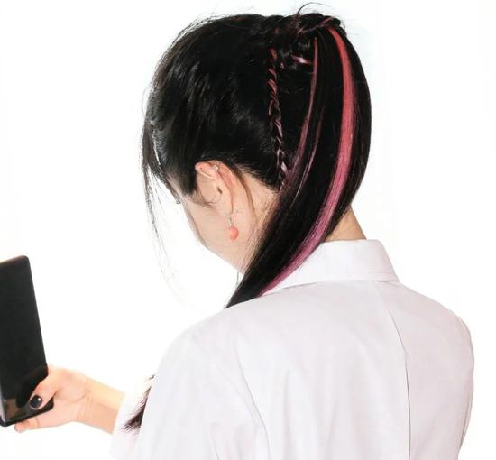 所以想要出彩就得多搞点花样,开头幂幂加入了粉色的假发片做成挑染的效果是今年比较流行的样式,也特别好借鉴。