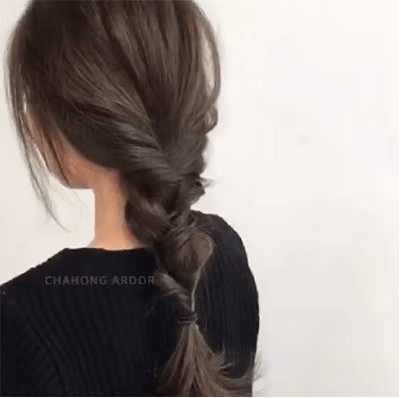 先扎一个普通的马尾,再编成三股辫,绑到最后用发圈固定住,留出翘翘的发尾。