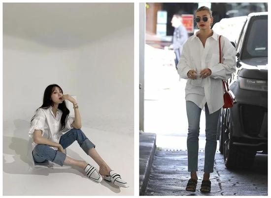 李圣经欧尼和Hailey Bieber两位超模偶像将白衬衫一个穿出性感,一个穿出随性。可见白衬衫的百变属性。