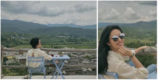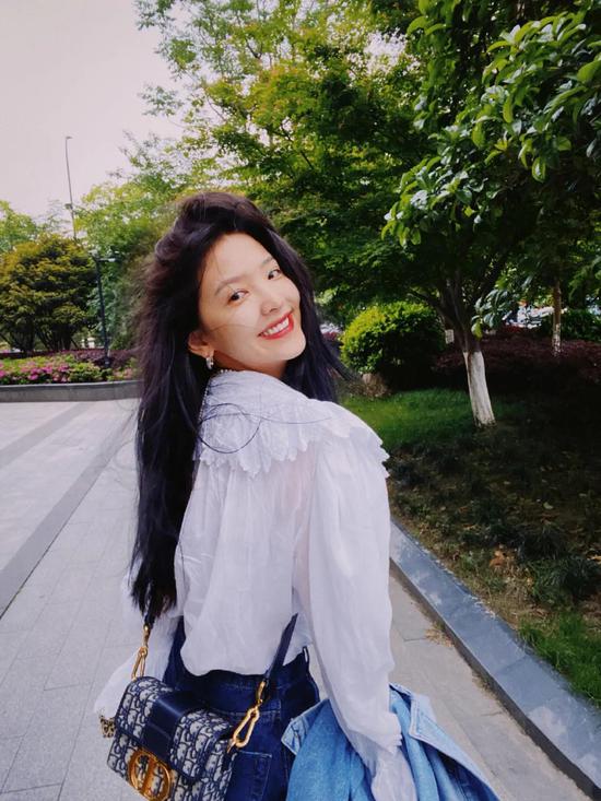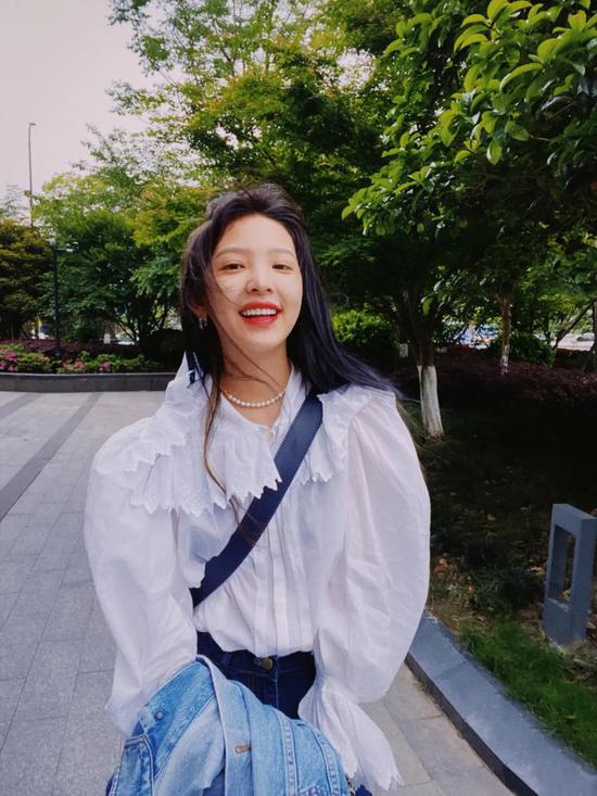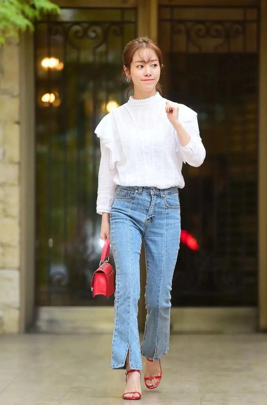 尤其是她的白衬衫+牛仔裤简直可以称为穿搭模版。某日午后花园中的杨采钰,身穿飘带白衬衫,浅蓝色牛仔裤,身后的红墙更烘托着浓浓的欢愉气氛。