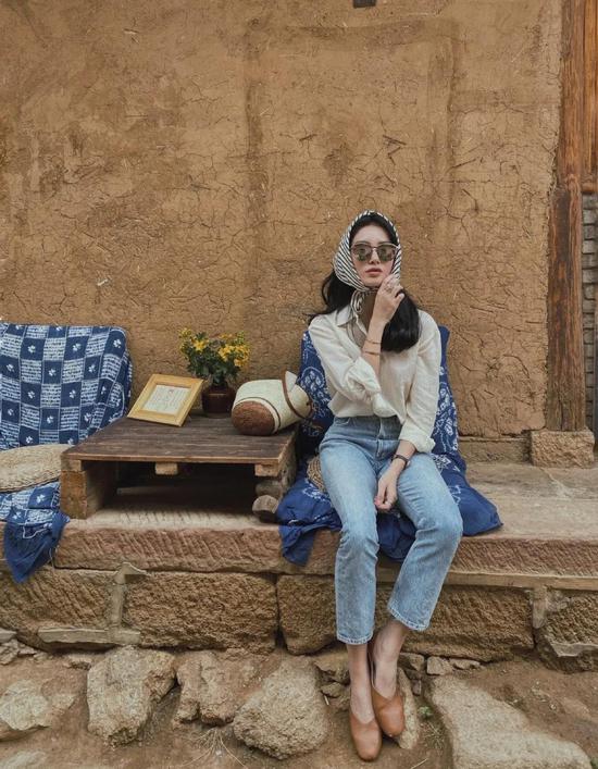 到了古城更是将丝巾变头巾,妥妥的法式ins风格。