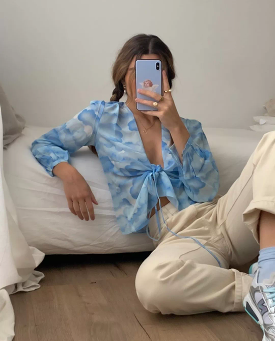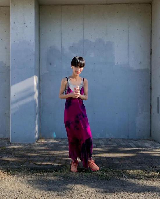 一件淡蓝淡紫色的扎染毛衣外套,松松垮垮,被她穿出一种软萌小可爱的感觉。低饱和度的扎染遇上宽松舒适的版型,轻轻松松就是冰淇凌女孩。马上入秋天气变凉了,这两套搭配可以照搬了。