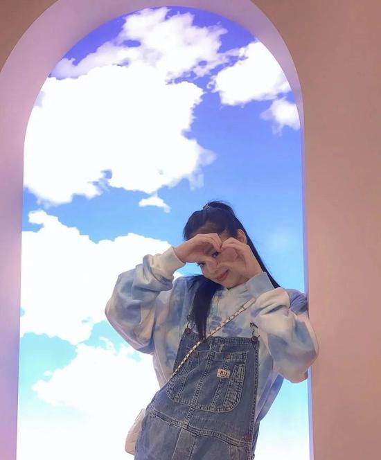 把天空穿在身上,天蓝色的扎染卫衣,搭配背带牛仔裤,满屏的小清新。