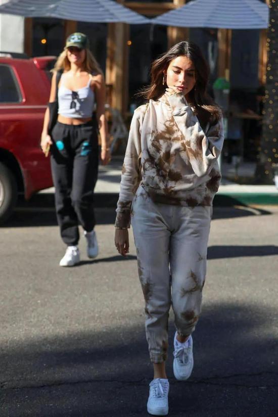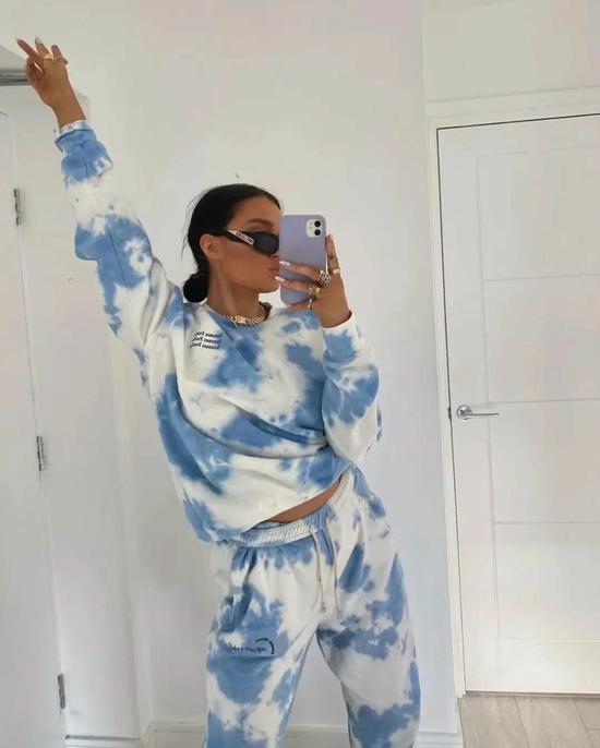 Total扎染,同色系的卫衣和运动裤搭配,舒适又时髦。随便出街逛个超市、锻炼个身体的,休闲时髦两不误。不过建议姐妹们选择这种饱和度比较低的颜色,不然很有可能误入精神小妹那个梯队的。
