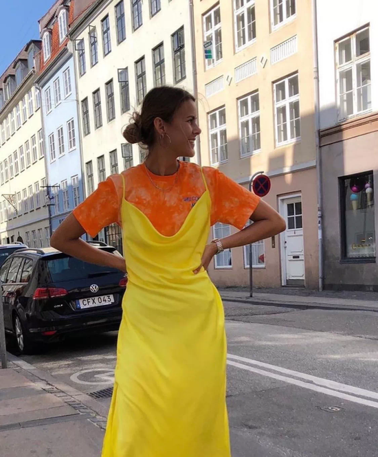 这次,咱们来点儿高级的。因为扎染本身就已经足够花里胡哨的了,所以在搭配上,就不要太复杂了。选择沾染元素中的一个颜色,然后做顺色搭配,这样的纯色单品就是最保险的了。嫌它太浮夸?作为内搭穿在外套里,比起纯色T恤来,它能立马将你z合格时髦精从一般选手里划分出来。
