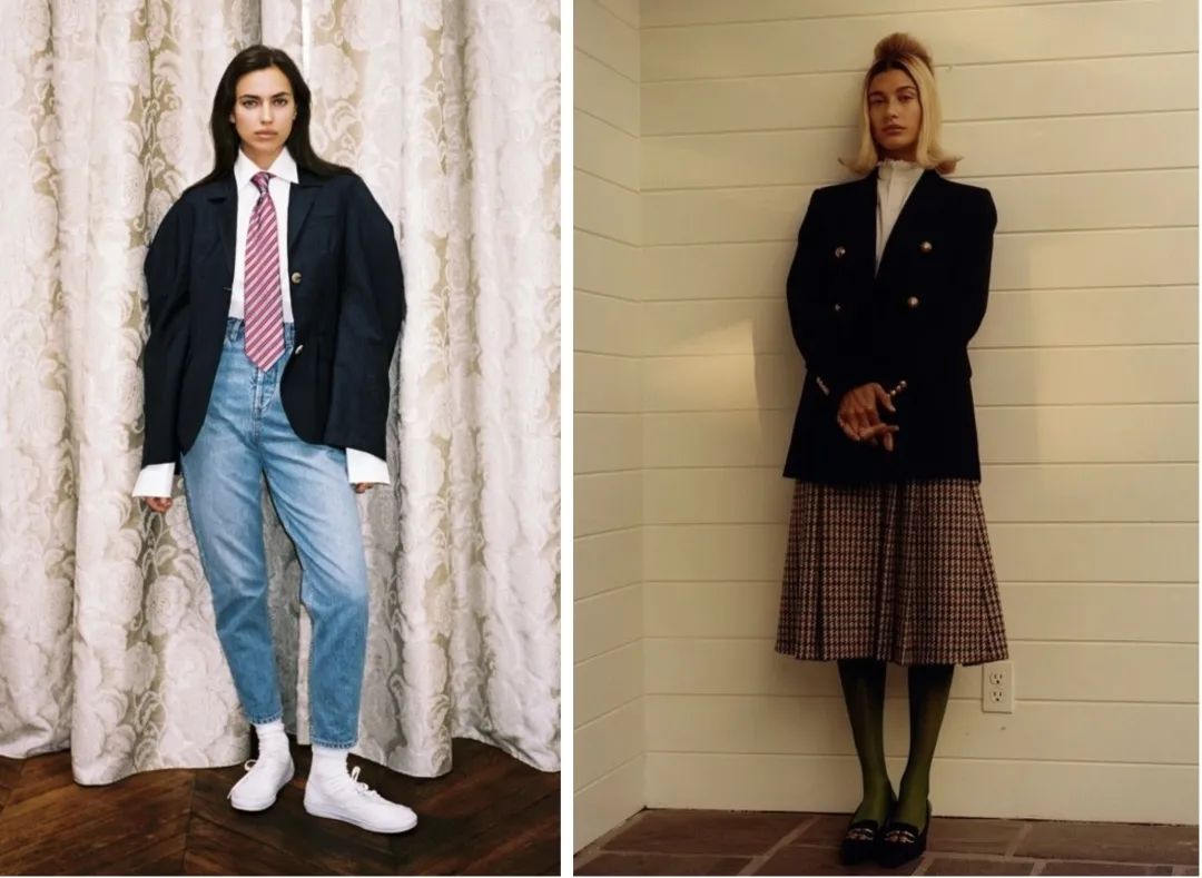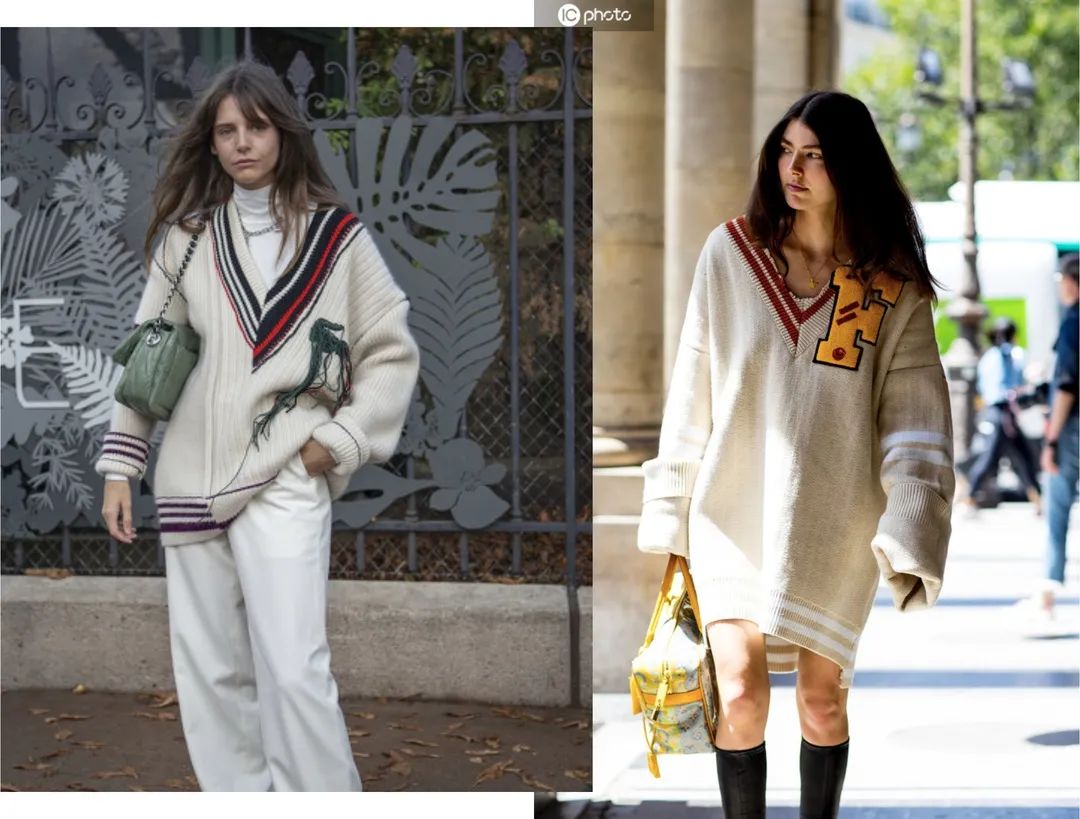 大方领就是让针织衫更具学院活力感的关键之一,你看Hailey Bieber的白色针织外套,就很像校服的针织版,大大的领口十分具有时髦感。