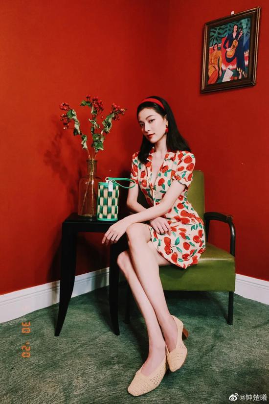 换上一条挂脖紧身裙,搭配上一头90年代小卷发,钟楚曦又能变身在台上款款唱粤语老歌的复古女郎。