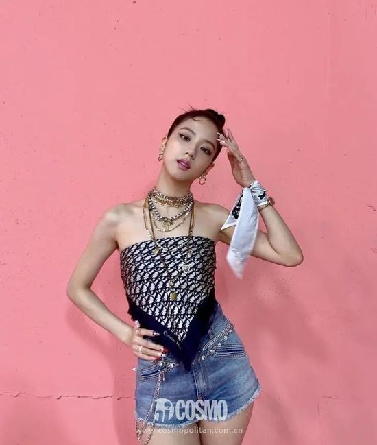 同样,Jisoo在MV中的造型也是pick了两条完全不同风格的腰链,像吊带热裤这种最标准的少女穿搭在系上了条腰链后,瞬间就多了点率性不羁的味道。