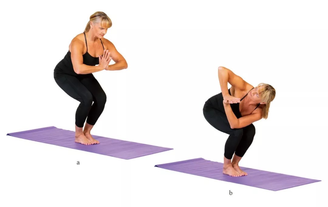 动作:最大幅度深蹲,双手合掌放在胸前做祈祷式(见图a)。保持臀部周正,双膝对齐。上身扭转向一侧,让肘部越过对侧大腿,保持掌心相对,两小臂呈一条直线(见图b)。