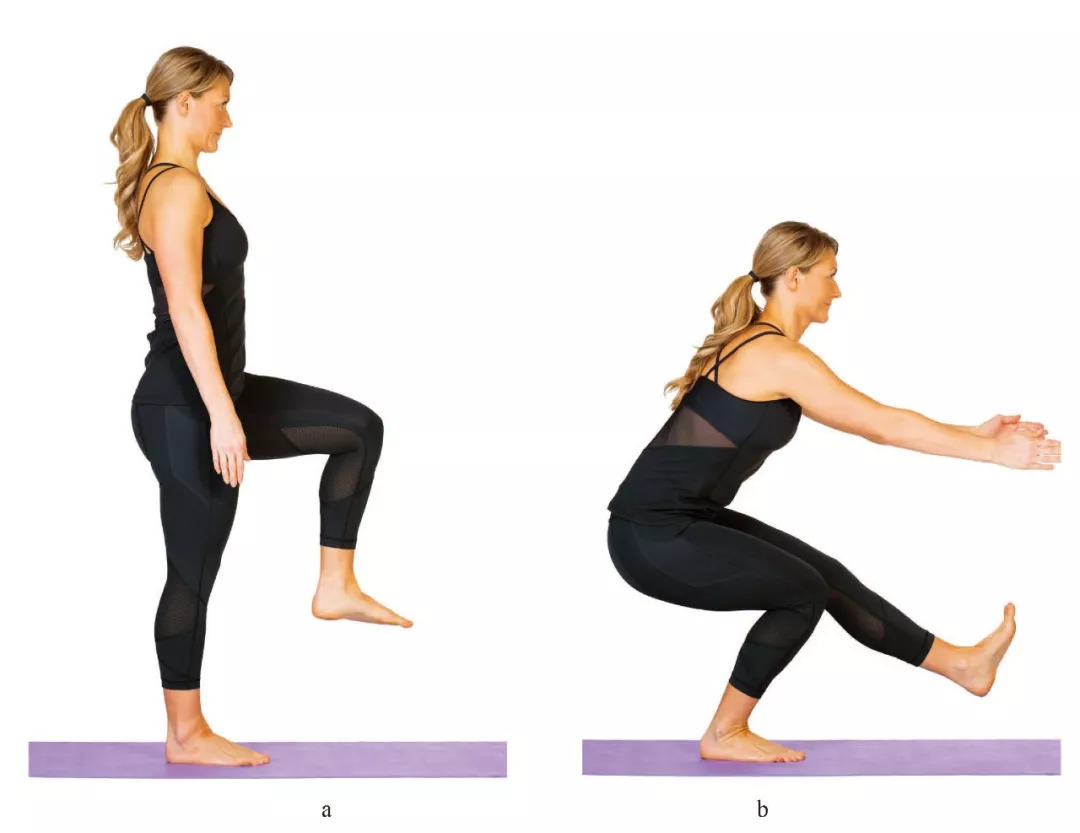 动作:保持单腿抬起,弯曲支撑腿的膝盖,臀部下蹲(见图b),保持单腿平衡。
