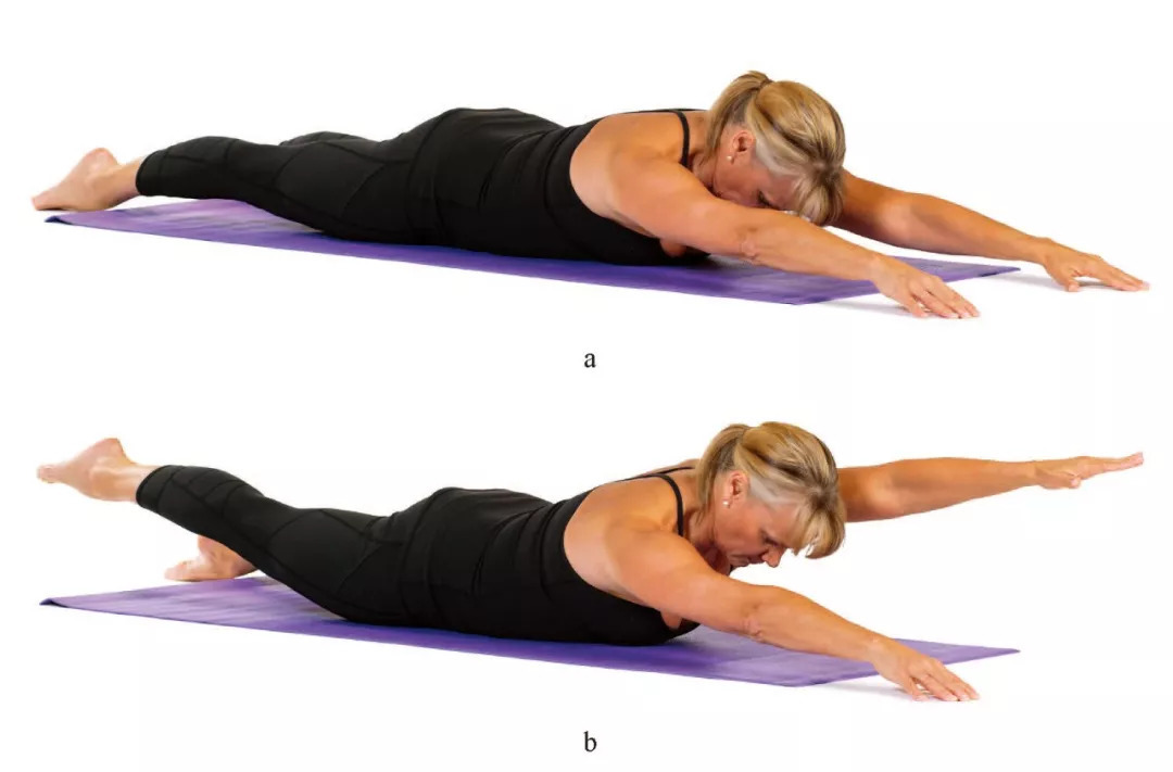 动作:将上身抬起,做一个背部拉伸,腿部做低位髋关节伸展。抬起一只手臂和对侧腿(见图b)。在保持臀部和腰部稳定的基础上,手和腿同时下落,并切换抬起另一只手臂和对侧腿。两侧互相轮换形成游泳动作。