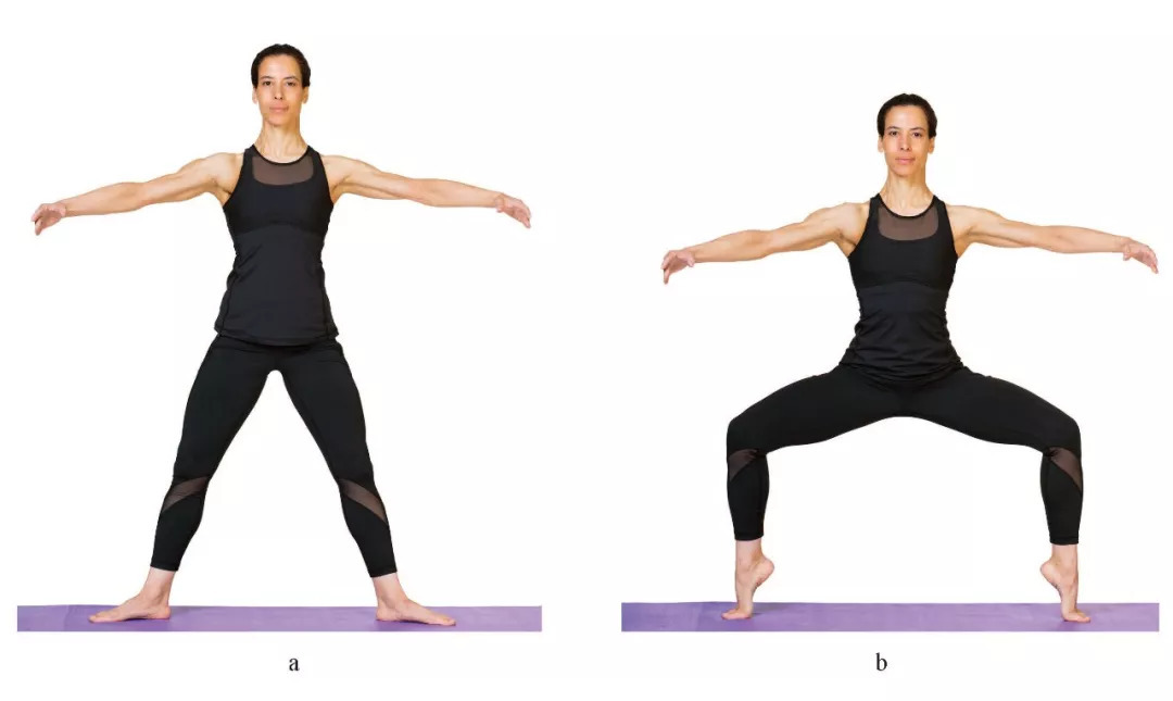 起始姿势:站姿,双脚分开,略宽于肩,髋部外旋,脚趾外展,双膝与脚尖对齐(见图a)。骨盆处于中立位置,使胸腔位于髋部正上方。提起盆底肌肉和下腹部肌肉,向核心收缩。