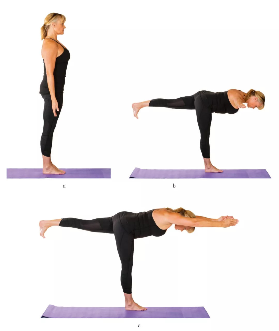 动作:手臂侧平举,与肩同高。单腿支撑稳定重心,身体前倾,悬空腿伸直向后抬起。躯干、头部和抬起的腿部成直线,与支撑腿呈T 形(见图b)。