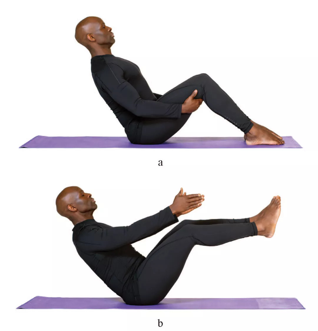 动作:向后倾斜,以坐骨保持平衡,保持背部挺直,形成一个V 形。将脚从地板上抬起,将双手从腿后挪开,沿肩部向前伸(见图b)。