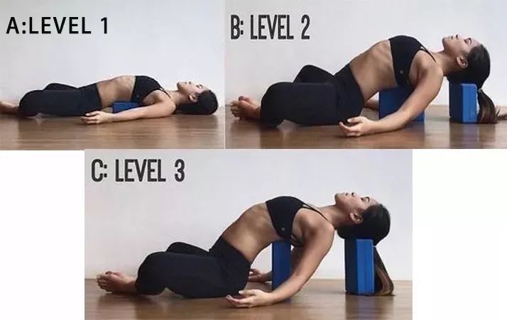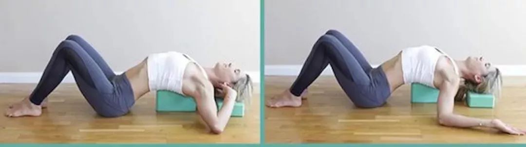 · 取两块瑜伽砖,一块竖着放在胸骨的下方,一块放在头下,同时屈手肘放在耳朵的两侧,保持1-2分钟;