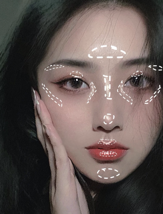 判断自己脸上哪儿能打高光的方法很简单,打开手机相机功能,开启闪光灯拍照模式,对着自己的正脸拍一张,侧脸拍一张,光亮特别明显的地方,就是你可以打高光地方了。大概就是这些位置: